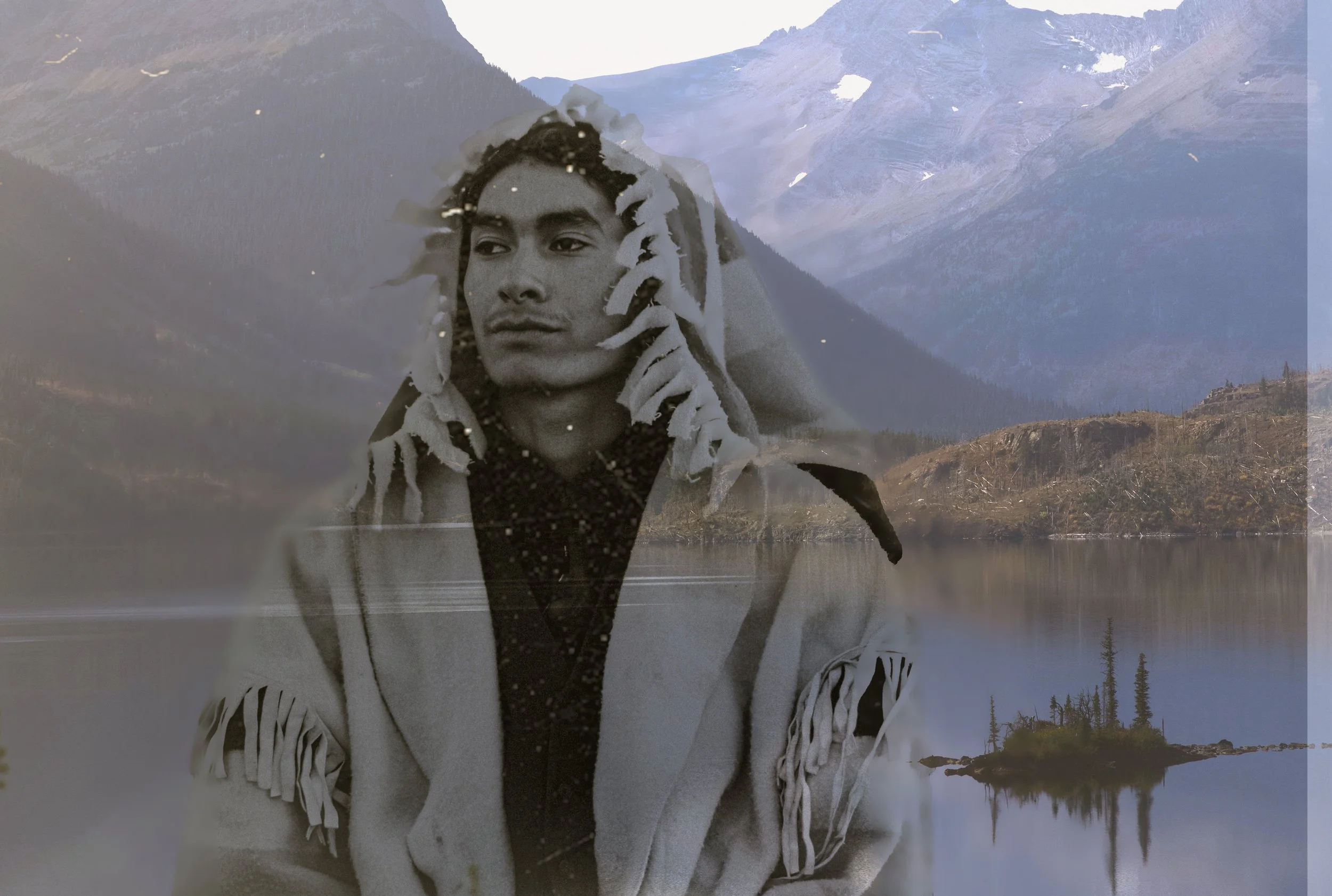 This double-exposure image layers a Blackfeet man in ceremonial regalia with the contemporary landscape of Wild Goose Island, once known as Holy Person Island. The image reflects how original place names and their teachings are rooted in cultural and spiritual understanding, and how they continue to exist within the land alongside modern naming and use.